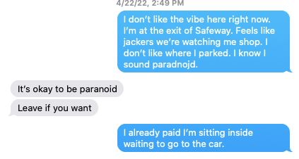 I texted my wife at home, and told her what was happening, and that I knew I sounded paranoid, but I planned to wait there for a few minutes before I go to my car.